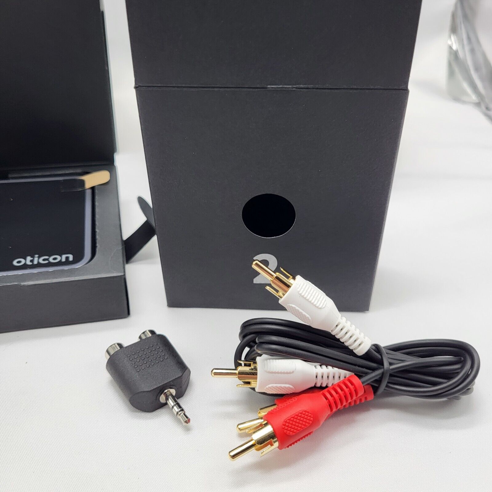 Oticon kaapelisarja TV-sovittimelle, joka sisältyy alkuperäiseen laatikkoon 2, sisältää RCA-kaapelin ja minijack-adapterin. Vaikka Oticon suosittelee TOSLINK-kaapelin käyttöä parhaan äänikokemuksen saavuttamiseksi, tämä paketti tarjoaa joustavat liitäntävaihtoehdot TV-adapterillesi. RCA-kaapeli kytketään TV ”L-R AUDIO OUT” -portteihin, ja minijack-adapterin avulla voit liittää laitteen kuulokeliitäntään. Tämä on ihanteellinen ratkaisu niille, jotka tarvitsevat vaihtoehtoisia liitäntätapoja.