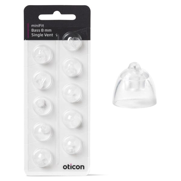 Oticon miniFit Bass Single Vent ovat luotu pehmeästä ihoystävällisestä materiaalista, joka sopii hyvin sinun korvaan. MiniFit kupoleista on luotu kolme erilaista versioita, joiden väliltä voit valita. Lukitut versiot (basso), jonka näet tässä, antaa intensiivisemmän äänenlaadun ja estää ulvonnan kuulolaitteella. Ne asettuvat syvemmälle korvakäytävään kuin avonainen versio, mutta sisältävät myös tuuletusaukot lukkiutuneen tuntemuksen estämiseen. Niistä on saatavilla koot 6, 8, 10, ja 12 mm halkaisijaltaan.