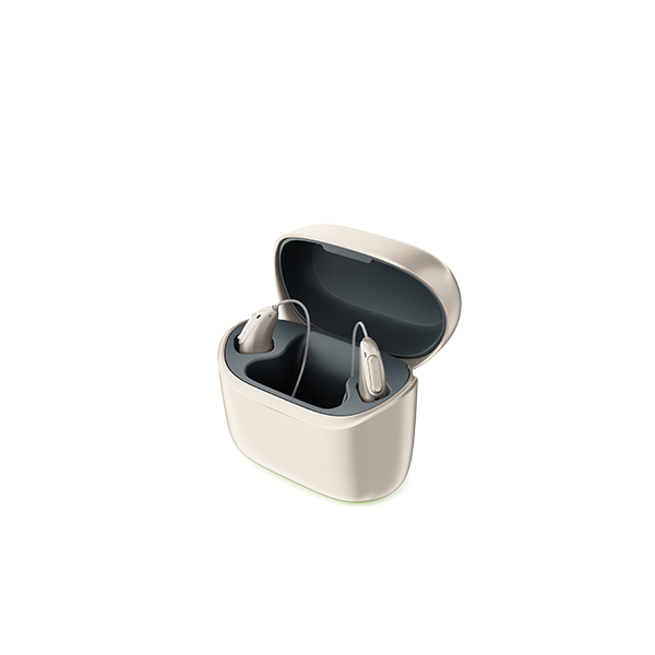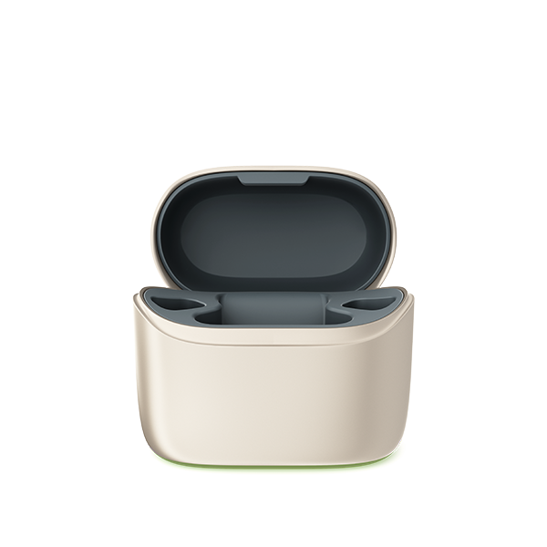 Laturi on erittäin käyttäjäystävällinen, eikä sinun tarvitse huolehtia kuulolaitteiden päälle tai pois kytkemisestä. Aseta Audéo Lumity -kuulolaitteet niiden omiin latausaukkoihin, ja ne sammuvat automaattisesti. Kun poistat ne laturista, ne käynnistyvät automaattisesti.
