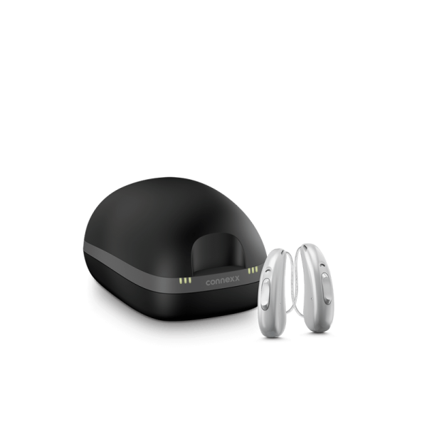 Suljettu latausasema Rexton-kuulolaitteille litiumioniakuilla.